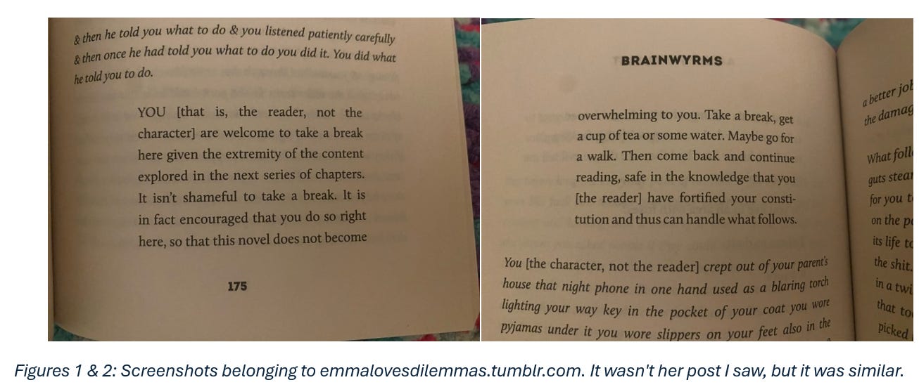 Had I read anything by this author before? / How did I come to know of it?: I don’t think I had heard of Rumfitt before. On Tumblr, I came across a screenshot of the novel, where Rumfitt breaks the fourth wall to give a content warning in the middle of a chapter: